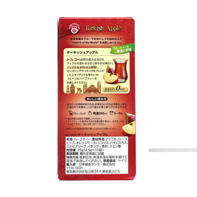 ポンパドールブランドは、1913年にドイツに誕生し、専門家により選び抜かれた良質な茶葉を提供し続け、100年の時を超え世界中で愛飲されているハーブティーブランドです。自然からの贈り物・ポンパドールハーブティーをぜひお楽しみください。 ポンパドールのターキッシュアップルは、トルコの自然の恵みを浴びたアップルを思わせる甘く爽やかな味わい。アップルを50%以上使用し、ローズヒップやイチジクをブレンドしたフルーツ&ハーブティー。