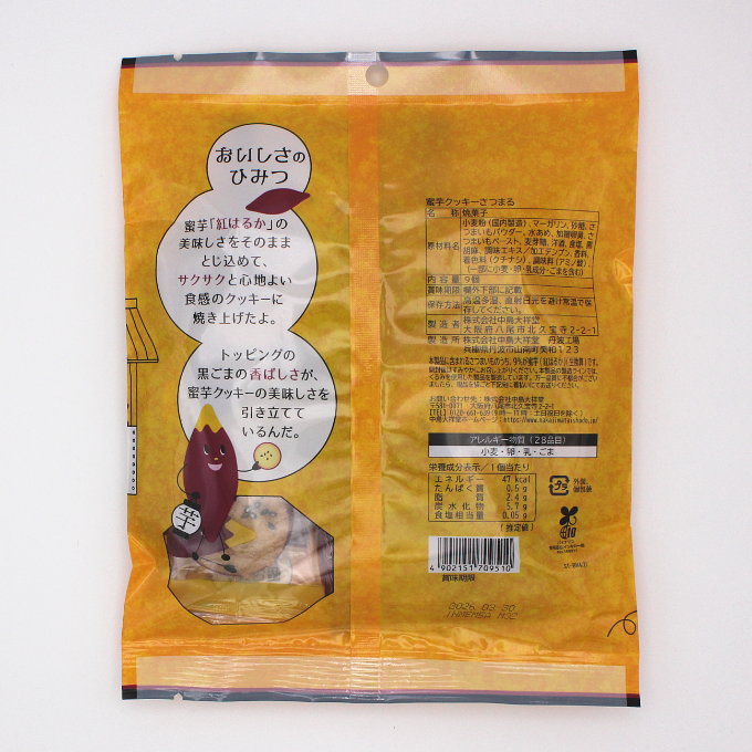 小麦粉(国内製造)、マーガリン、砂糖、さつまいもパウダー、水あめ、加糖卵黄、さつまいもペースト、麦芽糖、洋酒、食塩、黒胡麻、調味エキス/加工デンプン、香料、