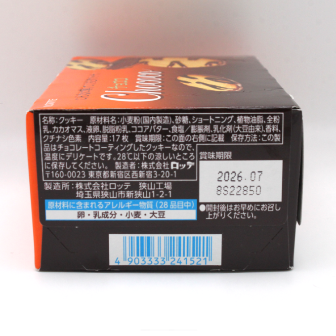 小麦粉(国内製造)、砂糖、ショートニング、植物油脂、全粉乳、カカオマス、液卵、脱脂粉乳、ココアバター、食塩/膨脹剤、乳化剤(大豆由来)、香料、クチナシ色素