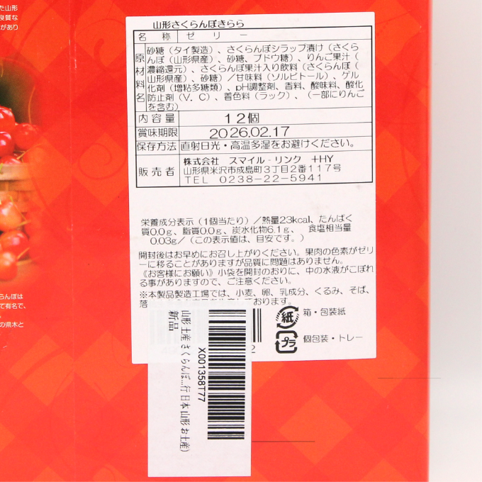 砂糖(タイ製造)、さくらんぼシラップ漬け(さくらんぼ(山形県産)、砂糖、ブドウ糖果糖液糖)、りんご果汁(濃縮還元)、さくらんぼ果汁入り飲料(さくらんぼ(山形県産)、砂糖)/甘味料(ソルビトール)、ゲル化剤(増粘多糖類)、pH調整剤、香料、酸味料、乳酸Ca、着色料(赤104、アナトー)、(一部にりんごを含む)